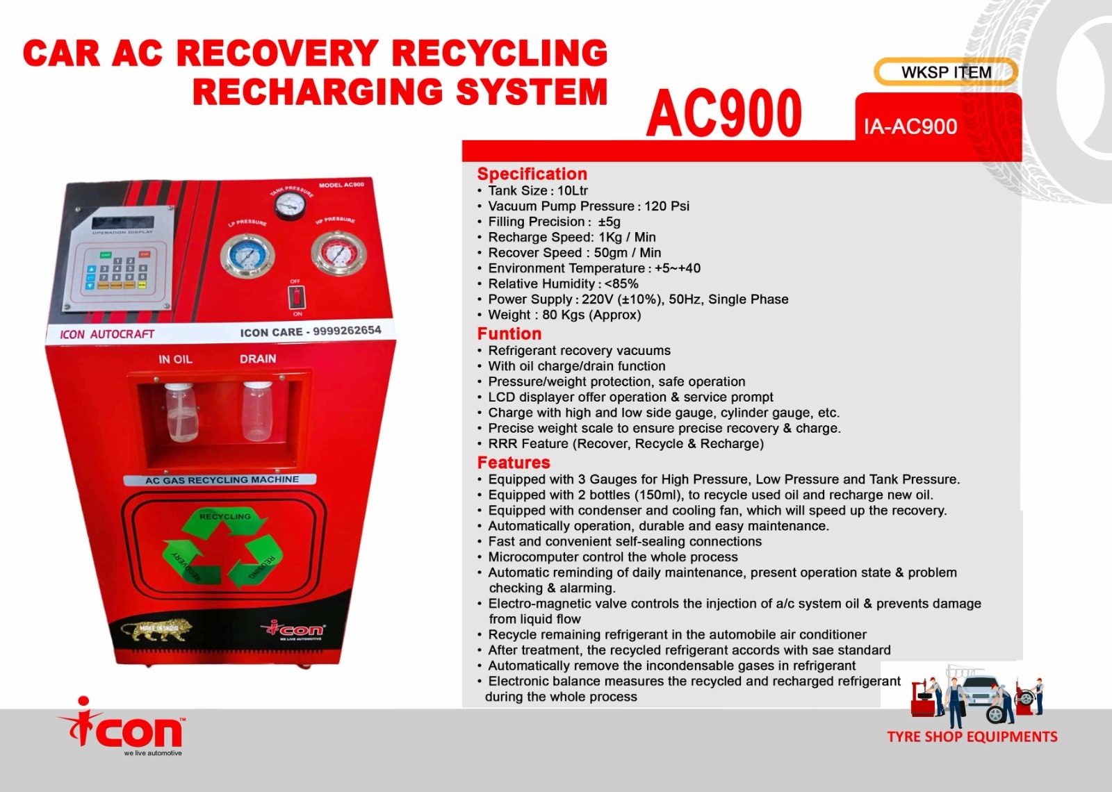 Whether you run a dedicated A/C repair shop or a general tire and auto service center, the Icon AC900 provides durable performance, easy maintenance, and sae-standard recycling compliance.