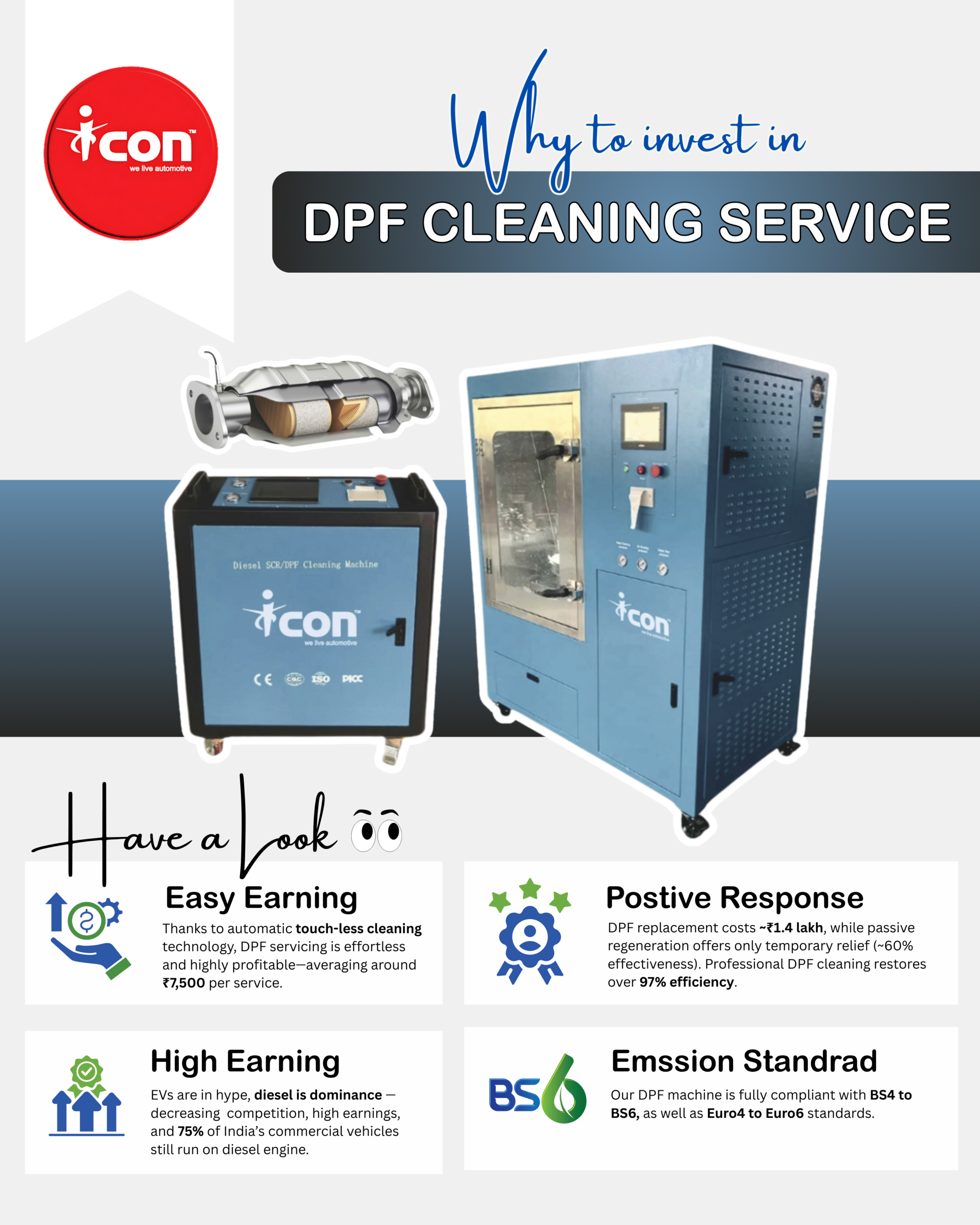 The Icon Autocraft DPF Cleaning Machine is more than just a cleaning tool — it is a complete solution for workshops dealing with BS4 and BS6 diesel vehicles. It cleans DPFs, DOCs, SCRs, and catalytic converters safely and effectively, restoring them to full efficiency. The machine is easy to operate, fast, eco-friendly, and built to last. It helps workshops save money, increase productivity, and offer better service to their customers.